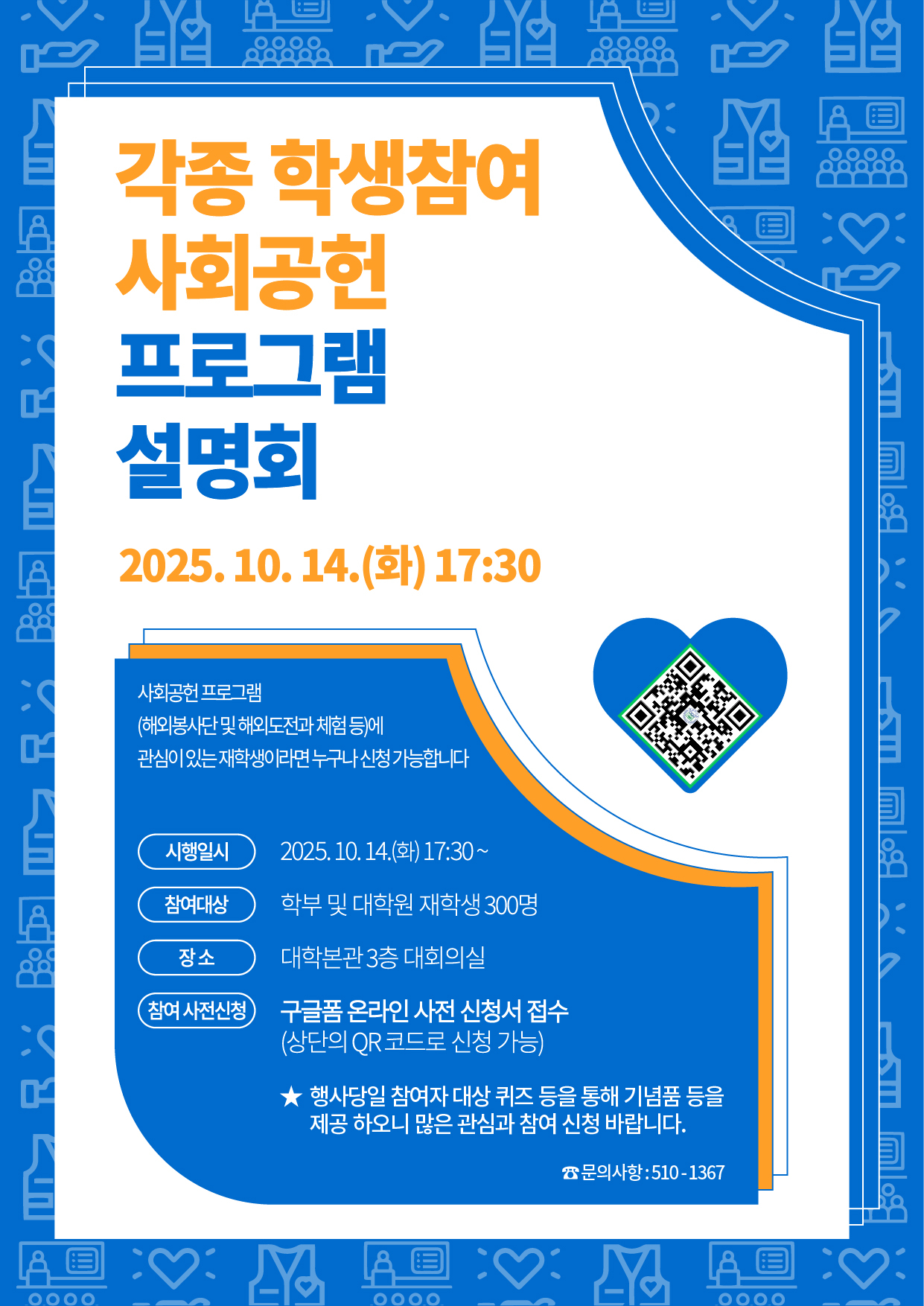 2025학년도 2학기 교내 재학생을 대상으로 각종 학생 참여 사회공헌 프로그램(해외봉사단, 해외도전과체험 및 대학생 멘토링 등) 설명회를 아래와 같이 개최합니다.