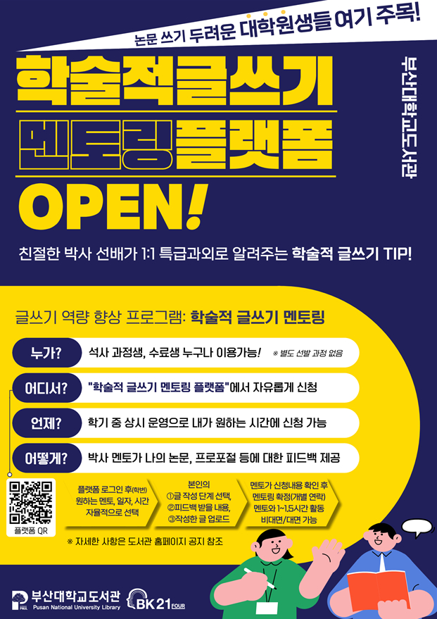 우리 도서관에서는 4단계 BK21 대학원혁신사업으로 대학원생의 글쓰기 역량 향상을 위해 「학술적 글쓰기 멘토링」을 운영하고 있습니다.글쓰기 멘토링 상시 제공 및 학생들의 원활한 참여를 위한 글쓰기 멘토링 플랫폼을 오픈하였으니, 많은 관심과 이용 바랍니다.