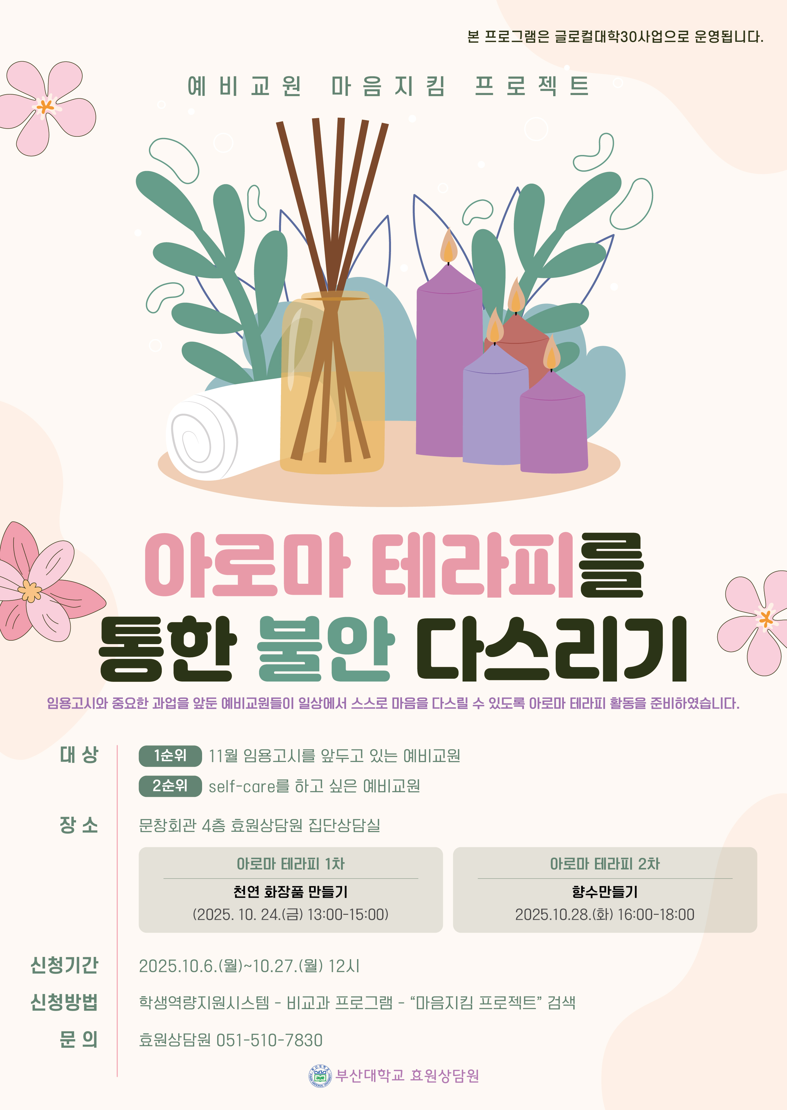 1 | 아로마 테라피: 천연화장품 | 2025.10.24.(금) 13:00-15:00 | 효원상담원 집단상담실 (문창회관 4층) |