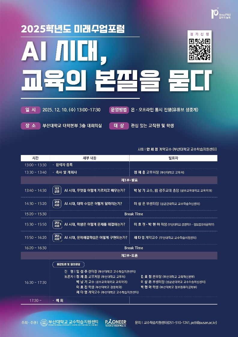 우리 대학의 교수학습지원센터에서는 변화하는 대학교육의 흐름을 이해하고, 앞으로 나아가야 할 교수학습의 방향을 탐색하고자 『2025학년도 미래수업포럼』을 다음과 같이 개최하오니 많은 관심과 참여 바랍니다.